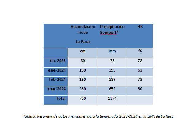 A pesar de haber sido una temporada húmeda, con un acumulado de precipitación total de 1172 mm, que se traducen a unos 750 cm de nieve estimados, la persistencia de las altas temperaturas ha impedido una verdadera acumulación de nieve, a excepción del mes de marzo.